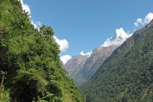 You will be transferred to the airport for the short flight to Pokhara, the starting point for treks to the Annapurna region. After visiting the Mountain Lodges of Nepal office for a short briefing you will transfer to the village of Lumle, about a one hour drive. You meet your trek team and set off walking up a paved trail to the top of the ridge, giving you good views of the Pokhara valley below. You then cross the ridge over into the valley of the Modi Khola River which leads up to the high peaks. You should then have your first views of the mountains, including Machhapuchare, the so called Fishtail Peak. You descend into this beautiful valley to your lodge for the night. The Sanctuary Lodge is set in a lovely location on a spur overlooking the River Modi, about twenty minutes from the village of Birethanti. If you have time on arrival you might like to make the short walk to Birethanti, an attractive Newari village with substantial houses and paved streets.