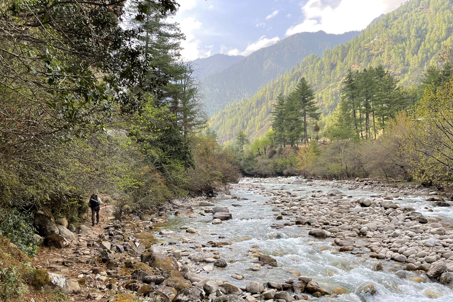 This is quite a big day! You wind up the gigantic gorge, sometimes with vertical cliffs, mostly with deep dark forest, the river rushing by in a nonstop series of rapids. There are quite a few bridges to cross, some new girder bridges, some old cantilever wooden ones. There are one or two places where it looks as if you could take ‘shortcuts’ - but this is not to be recommended. Sometimes the trail climbs high above the river, and parts of the path are stony and necessitate boulder hopping. You may be advised by your Bhutanese guide to walk with a companion on this section as there are still bears in this area. You pass a junction en route, where another trail leads north over the Tremo La to Tibet. Spencer Chapman crossed the Tremo La in 1937 on his way to climb Chomolhari from Tibet.